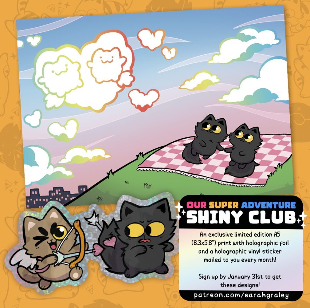 Also – new Shiny Club designs are here! Sign up over at patreon.com/sarahgraley before the end of January to get a limited edition shiny print and sticker in the mail from us!