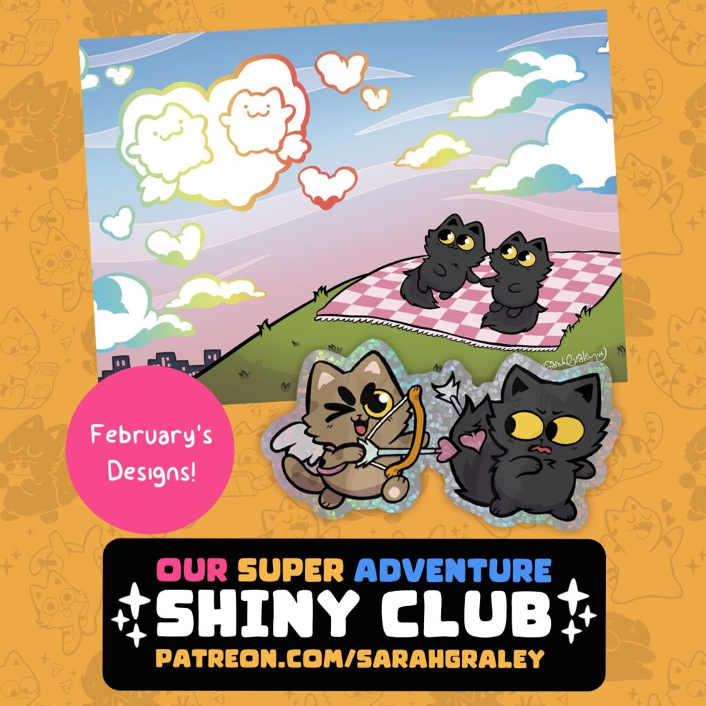 Also, the cutoff date for next month’s Shiny Club mailout is coming up! Sign up at https://www.patreon.com/sarahgraley before the end of January to get this shiny print and sticker in the mail! Shipping is included in the price, too!